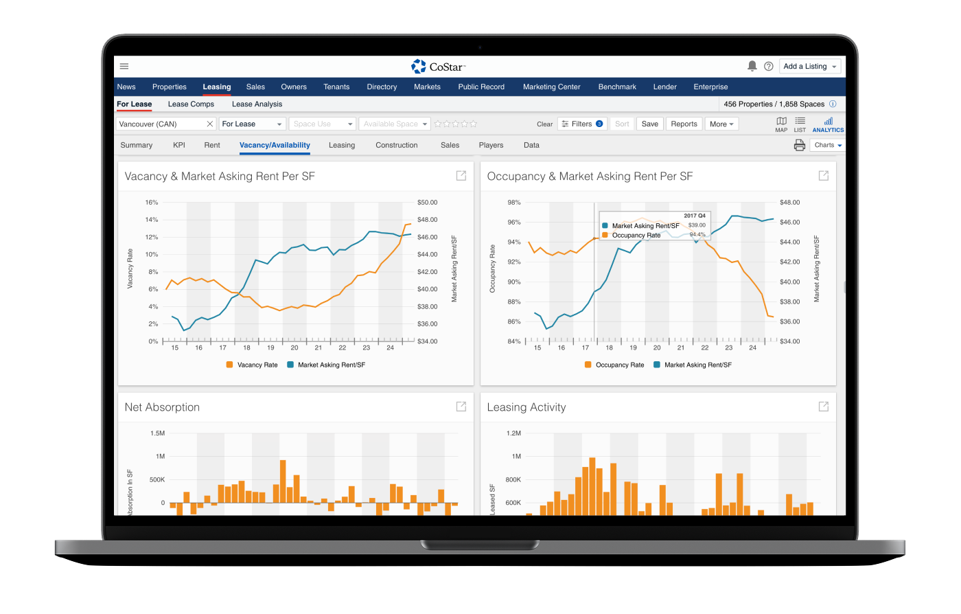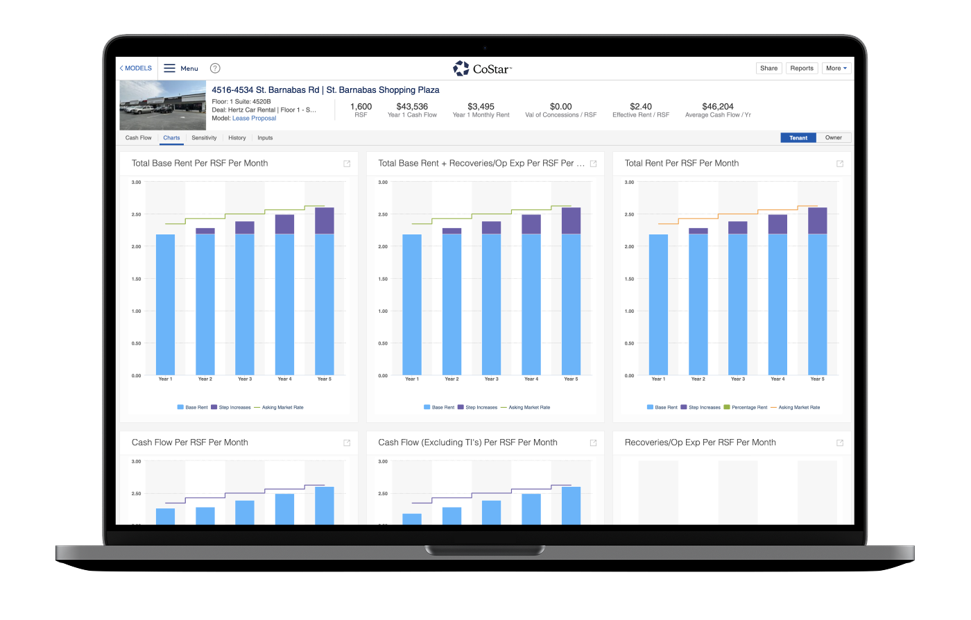 No more spreadsheets. Model up to eight lease scenarios at once with CoStar’s Lease Analysis tool, saving time and helping you optimize terms across new leases, renewals, subleases, and franchise support. Get deep property insights, including lease comps, lease activity, financials and peer tenants.