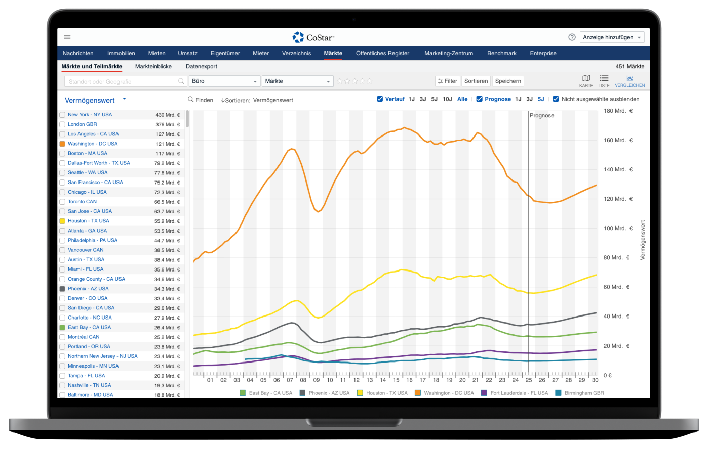 Gestützt auf eine umfangreiche Marktforschung, die mehr als 7,3 Mio. Gewerbeimmobilien-Datensätze und mehr als 20 Mio. Miet- und Verkaufstransaktionen umfasst, stützen sich die Berichts- und Analyse-Tools von CoStar auf Daten, die in ihrer Breite, Tiefe und Genauigkeit einzigartig sind.