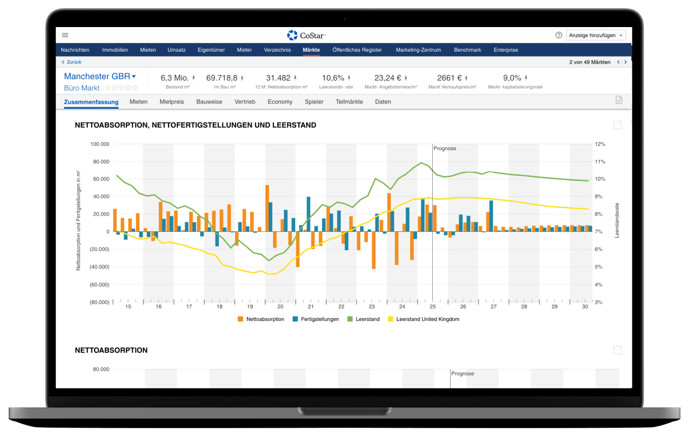 Mit den leistungsstarken Analysen für Gewerbeimmobilien von CoStar ist es einfach, aktuelle Trends zu bewerten und die Zukunftsaussichten für einen Markt, einen Teilmarkt oder eine benutzerdefinierte Gruppe von Gewerbeimmobilien weltweit mit Leistungskennzahlen zu verstehen, die auf unserer umfangreichen Marktforschung basieren.