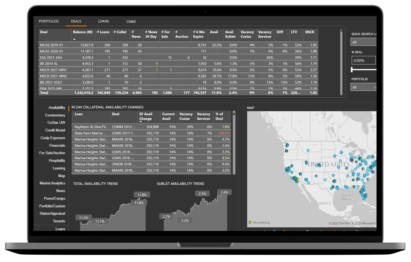 Eine umfassende CMBS-Investorenplattform, die die CMBS-Daten von INTEX, die branchenführenden CRE-Daten von CoStar, Marktanalysen und das COMPASS-Kreditausfallmodell integriert und direkt jedem Ihrer CMBS-Geschäfte, Darlehen und Sicherheiten zugeordnet ist.