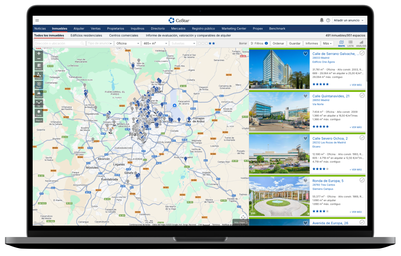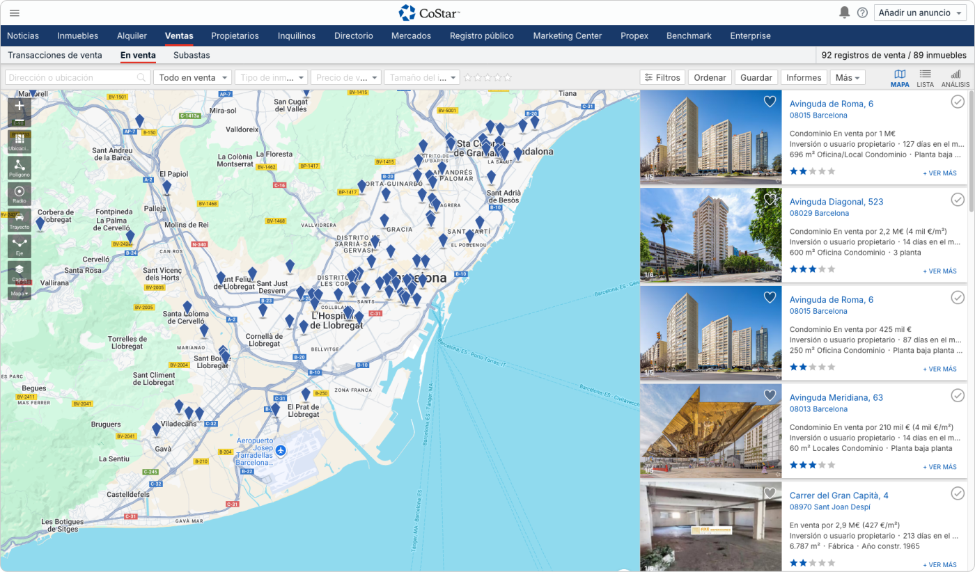 CoStar es la plataforma de negocios del sector de oficinas, locales, naves, terrenos y otros inmuebles terciarios. Aquí encontrarás hasta 1 millón de inmuebles comerciales en venta y alquiler, además de las subastas en línea de Ten-X y todo un mundo de oportunidades de inversión fuera de mercado.