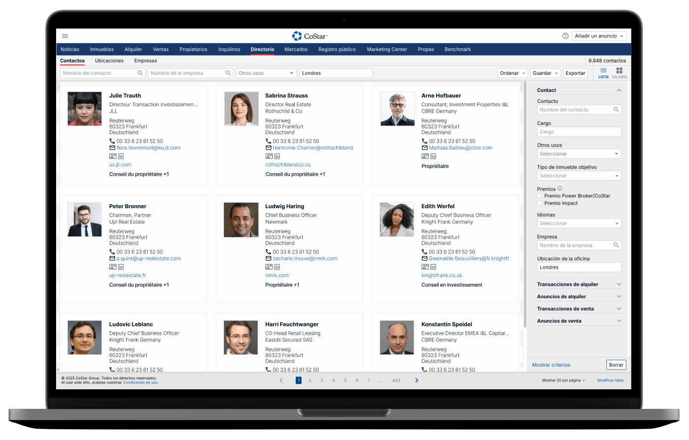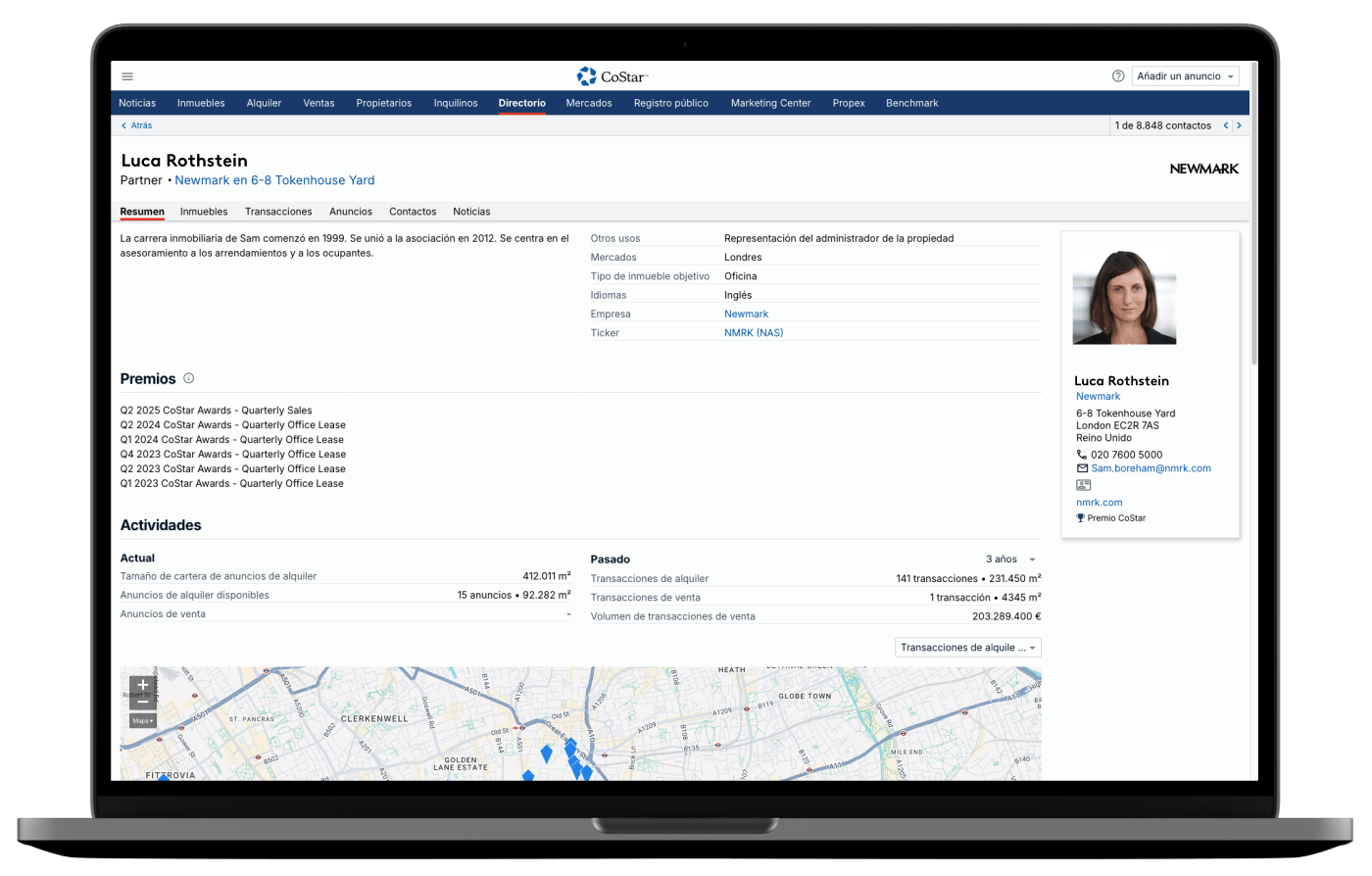 Ponte en contacto con profesionales del sector de oficinas, locales, naves, terrenos y otros inmuebles terciarios para identificar nuevas oportunidades. Busca contactos, ubicaciones o empresas en función de su especialidad, conocimiento del tipo de inmueble, experiencia en transacciones, número de anuncios activos, mercados cubiertos, premios CoStar ganados, etc.