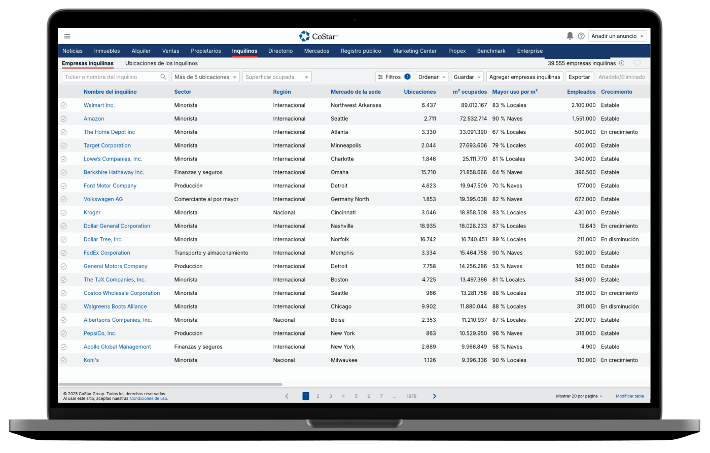 Obtén una visión detallada de los inquilinos comerciales a nivel de ubicación o de cartera. CoStar lleva a cabo un seguimiento continuo de los inquilinos comerciales en todos los sectores y zonas geográficas para ofrecerte toda la información que necesitas en un solo lugar.