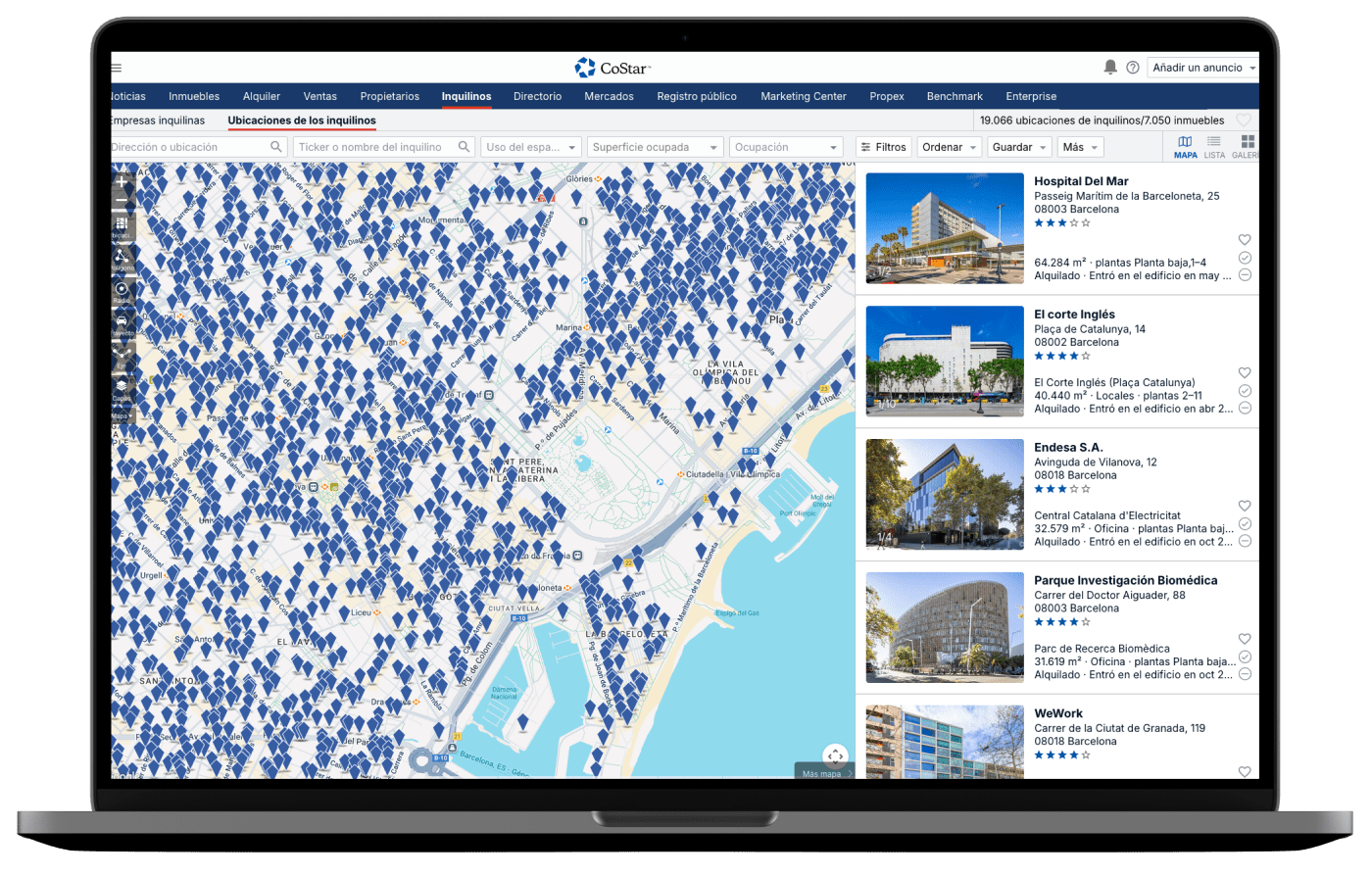 La función «Empresas inquilinas» te ofrece una visión completa de la cartera inmobiliaria de una empresa. Con ella podrás encontrar todos los datos y herramientas que necesitas para investigar, localizar y realizar prospecciones a nivel de cuenta corporativa.