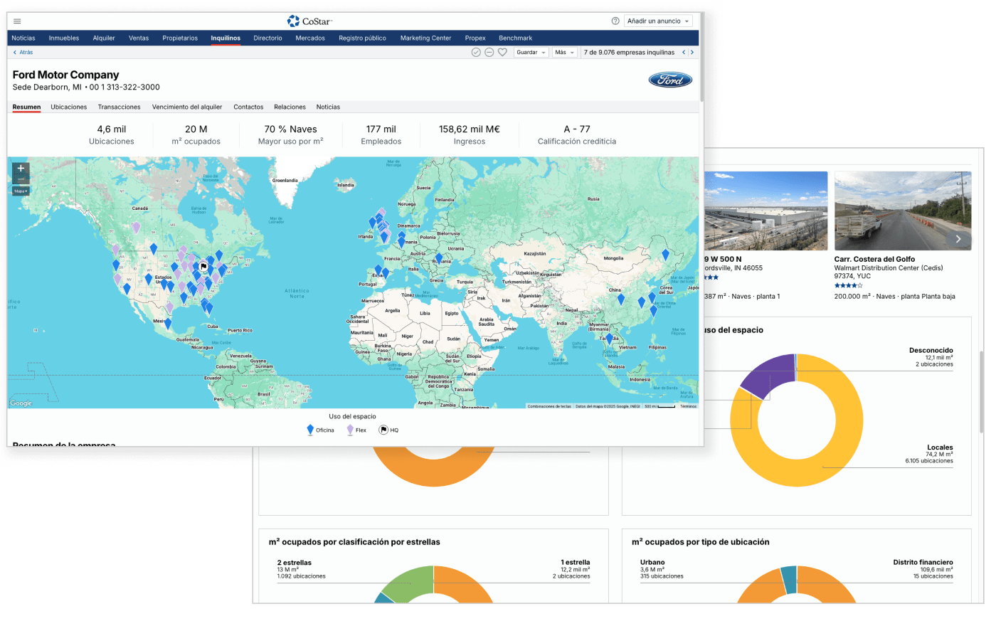 Consulta la información sobre la cartera inmobiliaria de una empresa inquilina, como sus ubicaciones, transacciones, vencimiento de los contratos de arrendamientos, contactos, relaciones, noticias, etc.