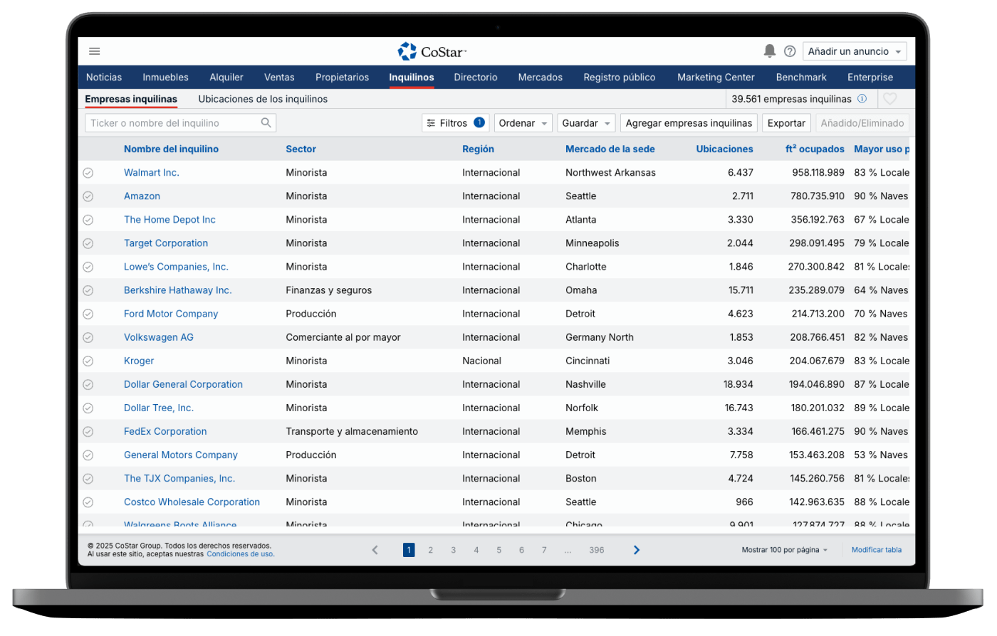 La función «Empresas inquilinas» le ofrece una visión completa de la cartera inmobiliaria de una empresa. Con ella podrás encontrar todos los datos y herramientas que necesita para investigar, localizar y realizar prospecciones a nivel de cuenta corporativa.