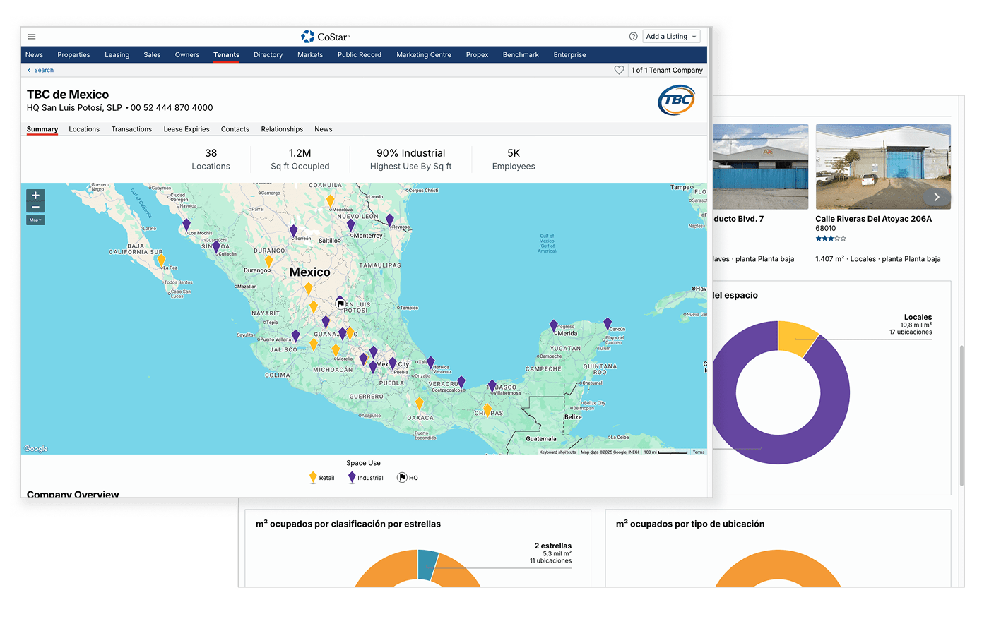 Consulte la información sobre la cartera inmobiliaria de una empresa inquilina, como sus ubicaciones, transacciones, vencimiento de los contratos de arrendamiento, contactos, relaciones, noticias, etc.
