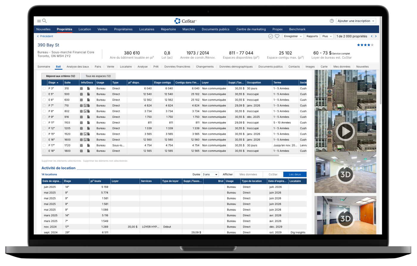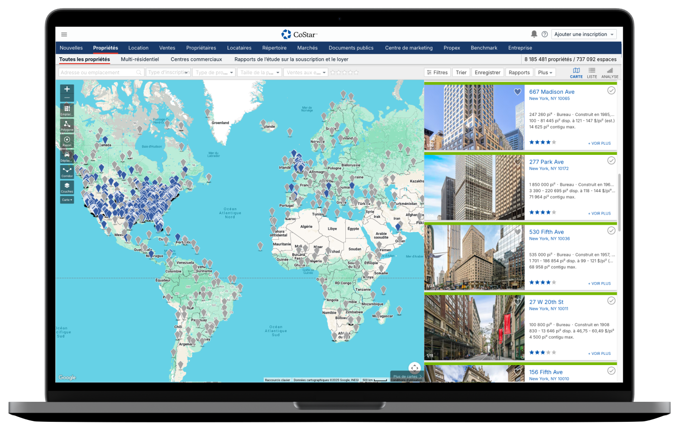 Trouvez des opportunités sur le marché et hors marché dans la plus grande base de données d’inscriptions de vente et de location, ainsi qu’un inventaire complet de propriétés commerciales.