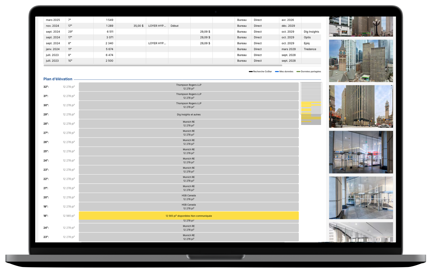 Accédez à tous les emplacements des locataires. Voyez l’espace qu’ils occupent et la date d’expiration des baux pour les aider à trouver un espace qui leur convienne et augmenter vos honoraires.