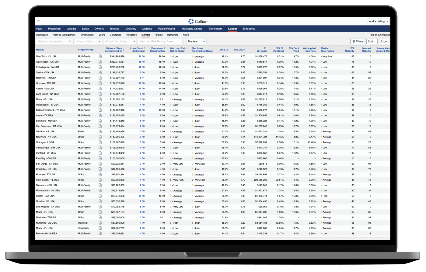 Profitez des informations sur les propriétés, des analyses de marché et du modèle de risque de crédit de CoStar, les plus fiables du secteur.