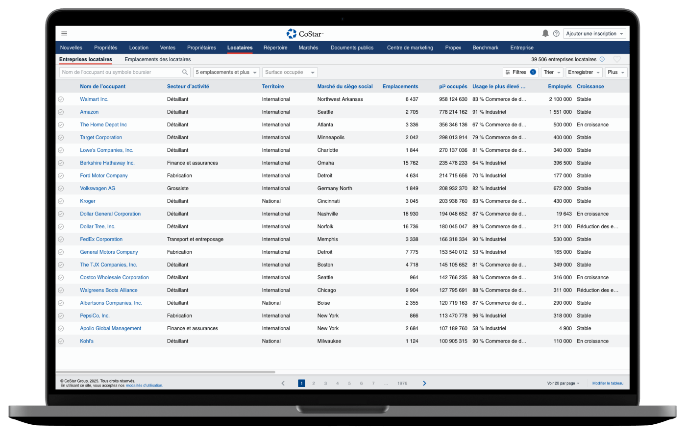 La fonctionnalité Entreprises locataires fournit un tableau complet du portefeuille immobilier d’une société, avec toutes les données et les outils dont vous avez besoin pour rechercher, localiser et prospecter au niveau de l’entreprise.