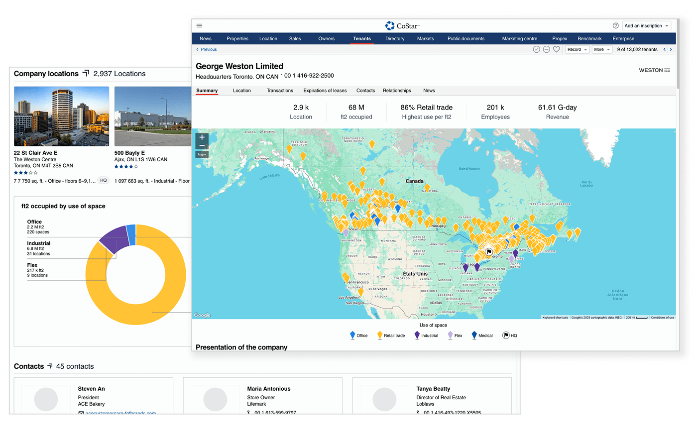 Consultez des informations sur le portefeuille immobilier d’une entreprise locataire, y compris les emplacements, les transactions, les expirations de baux, les contacts, les relations, les nouvelles et plus encore.