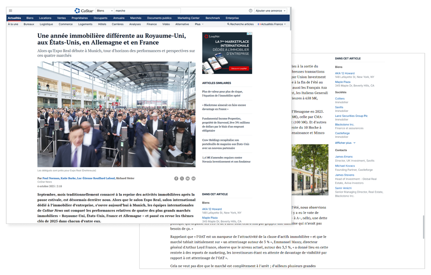 Avec CoStar Actualités, bénéficiez d’une vision complète du secteur immobilier : données clés, tendances de marché, transactions et acteurs majeurs, analysés par nos journalistes aux États-Unis, au Royaume-Uni, au Canada et en France.
