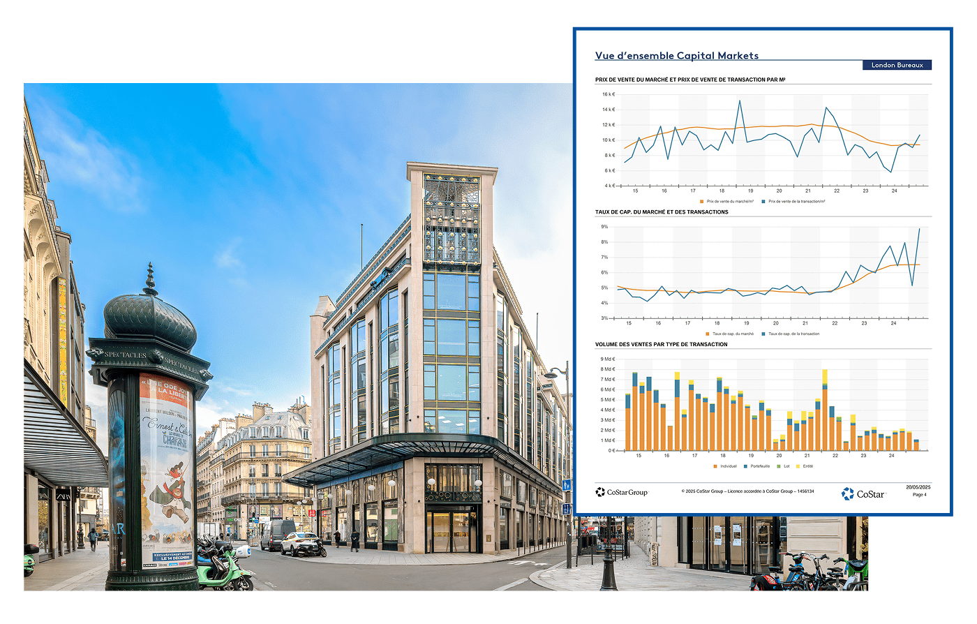 Explorez les tendances des flux de capitaux, des prix et du volume des transactions, appuyées par les recherches et les données exhaustives de CoStar.