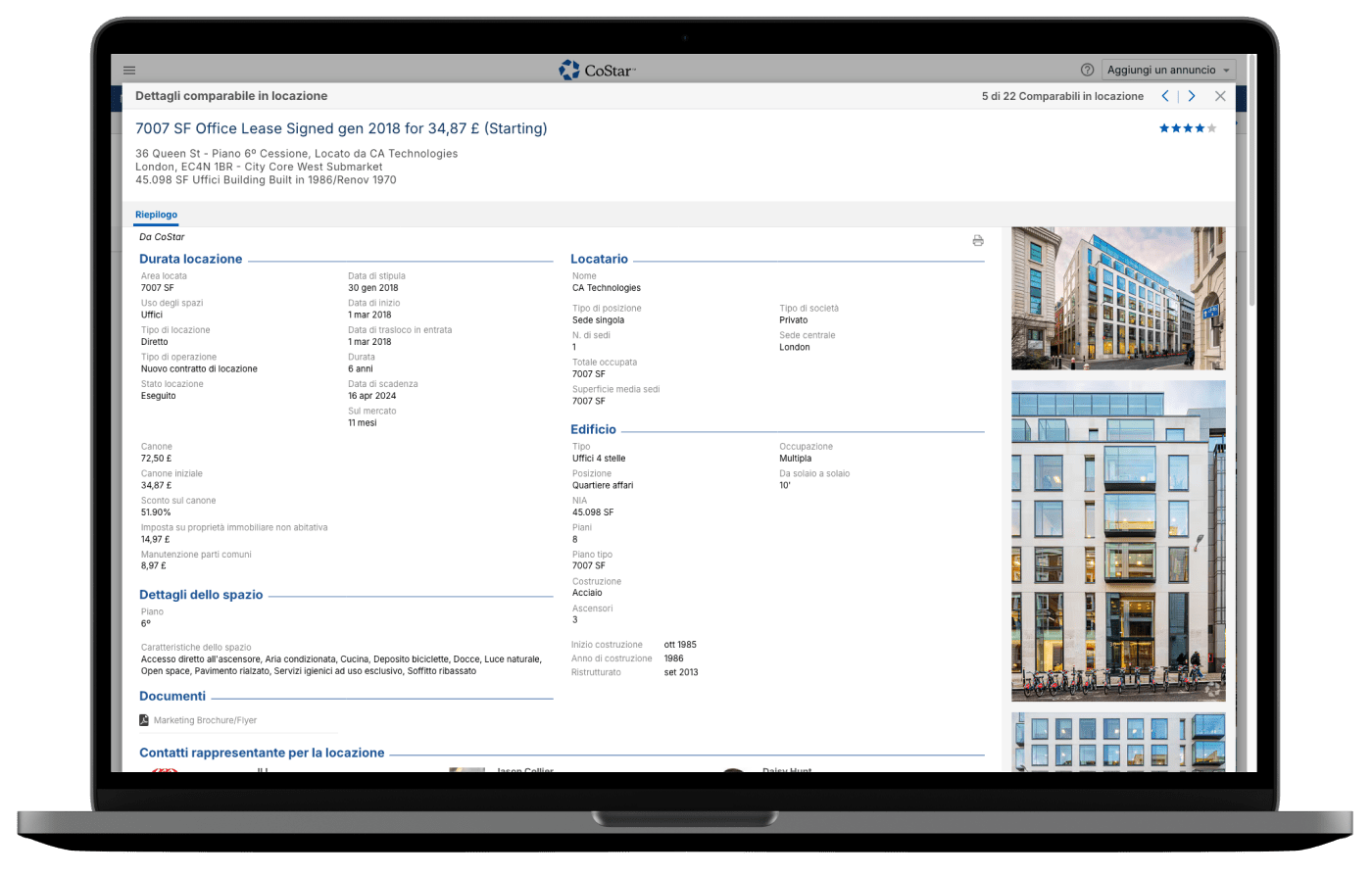 Grazie alla piattaforma intuitiva di CoStar, trovare informazioni dettagliate sulle locazioni di immobili commerciali non è mai stato così facile. Individua rapidamente e analizza dati verificati in modo indipendente su dettagli chiave, quali data di locazione, canoni richiesti, canoni effettivi, tempo sul mercato, date di scadenza e altro ancora.