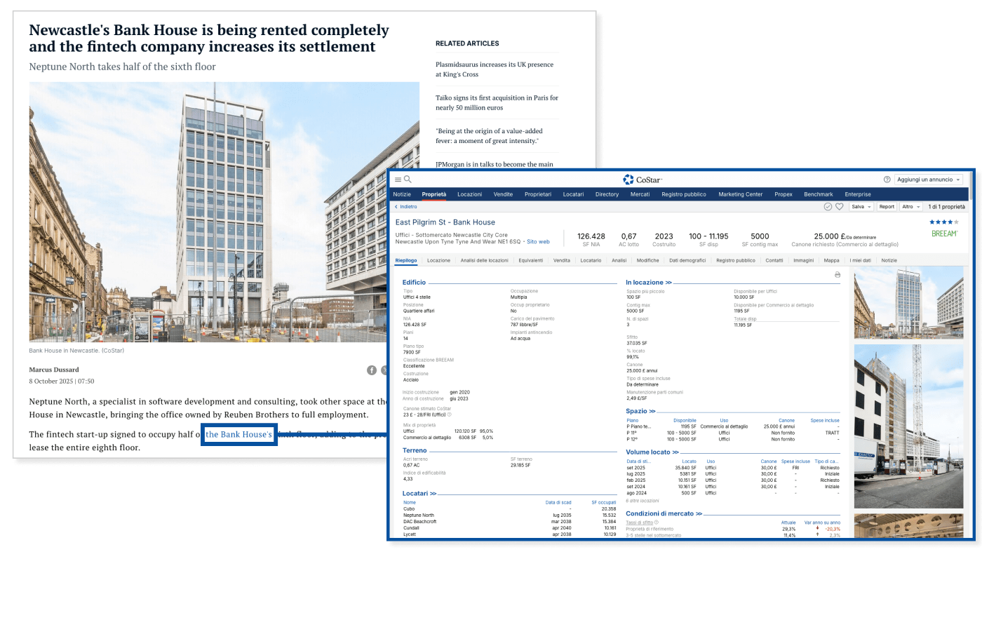 La redazione di CoStar pubblica articoli e analisi basati sulle informazioni ricavate dai dati di mercato di CoStar. Grazie ai link ai record immobiliari sottostanti, puoi passare agevolmente da notizie in tempo reale ai dati di mercato di dettaglio, il tutto nella stessa schermata.