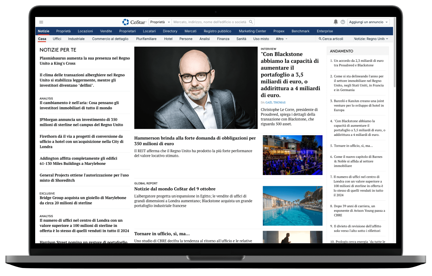 Consulta gli articoli di attualità direttamente dalle sezioni dedicate alle informazioni sui mercati e sugli immobili di CoStar.