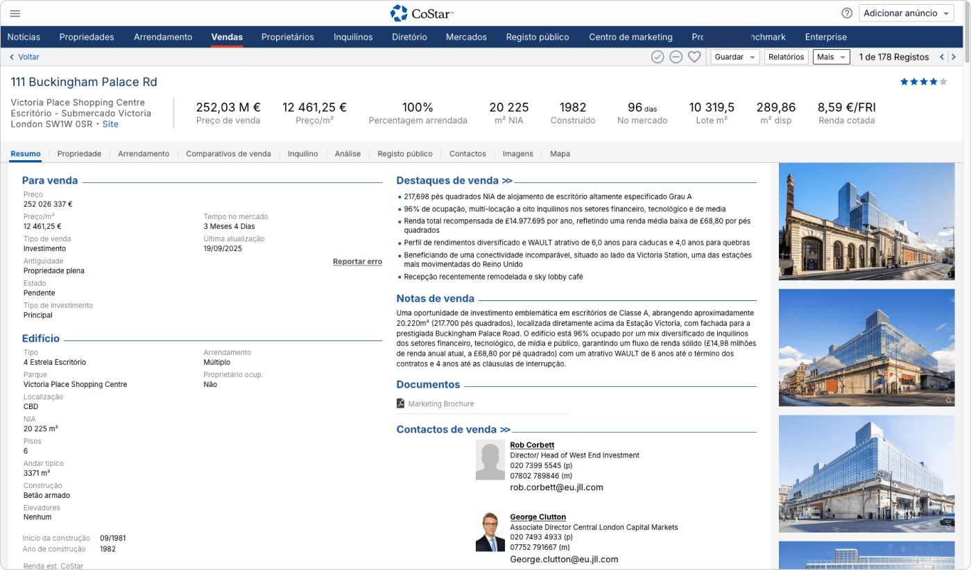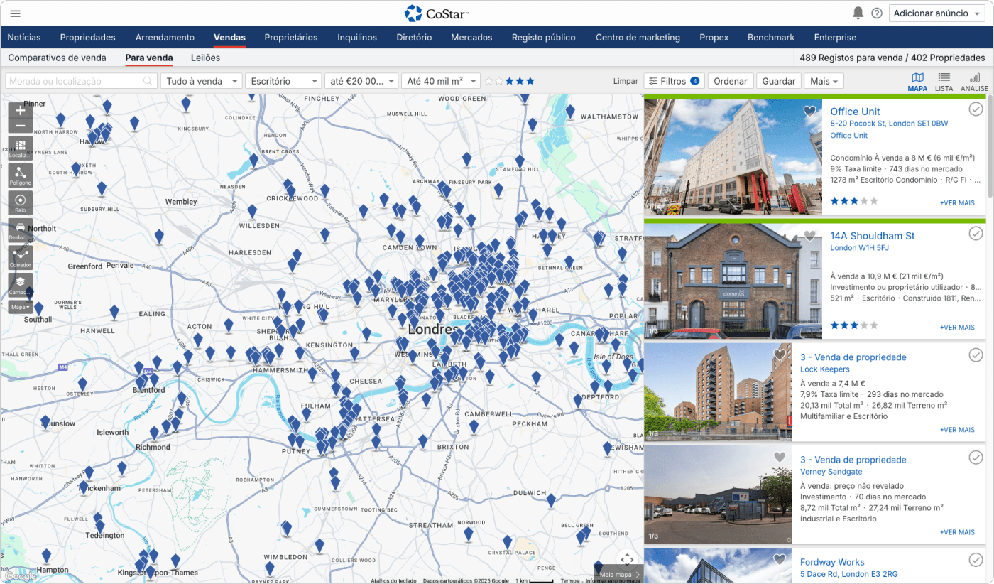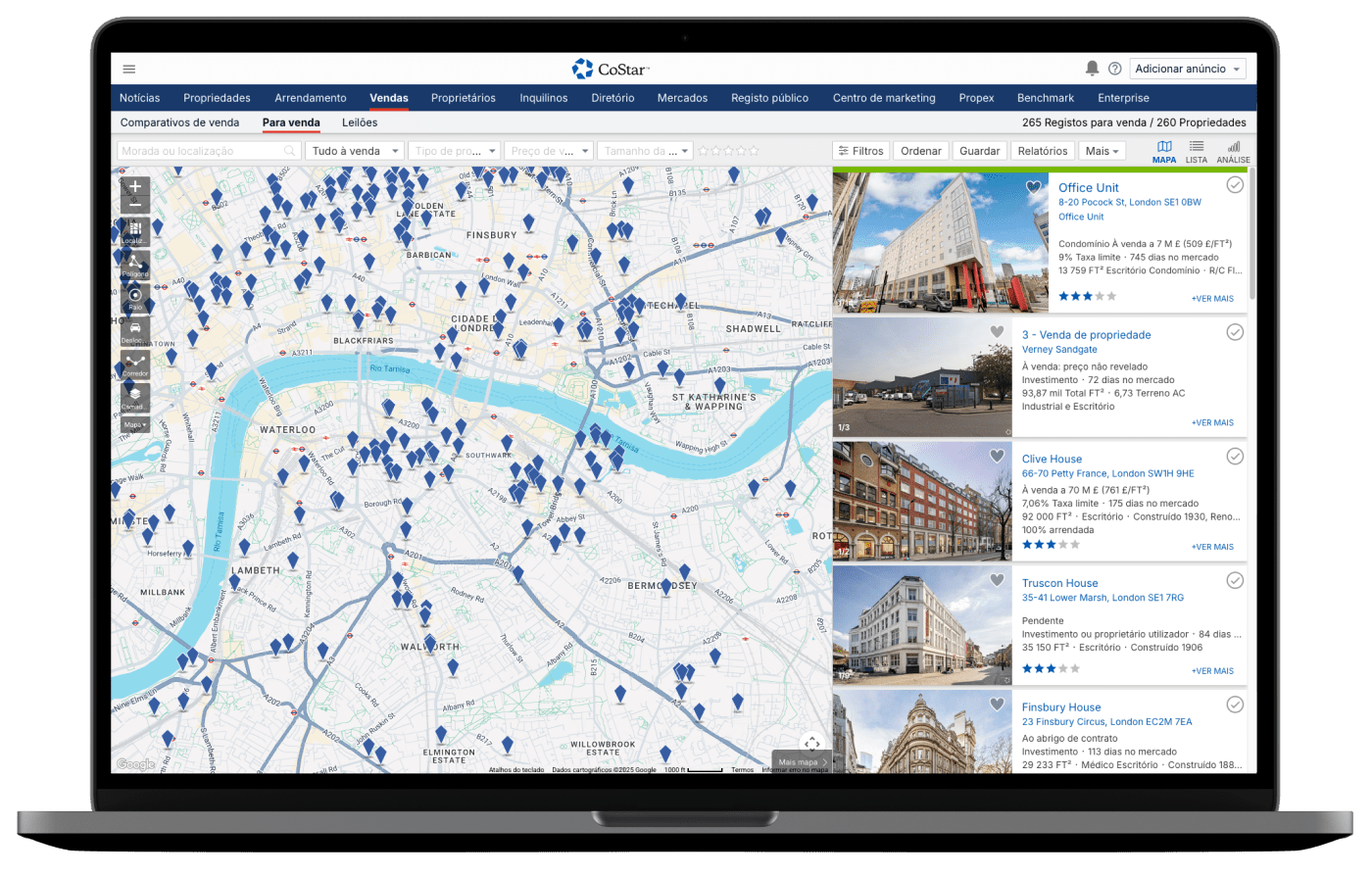 A CoStar é o local onde o setor imobiliário comercial faz negócios. Aceda a até 1 milhão de anúncios de propriedades comerciais para arrendamento e venda, além de leilões online da Ten-X e todo um mundo de oportunidades de investimento fora do mercado.