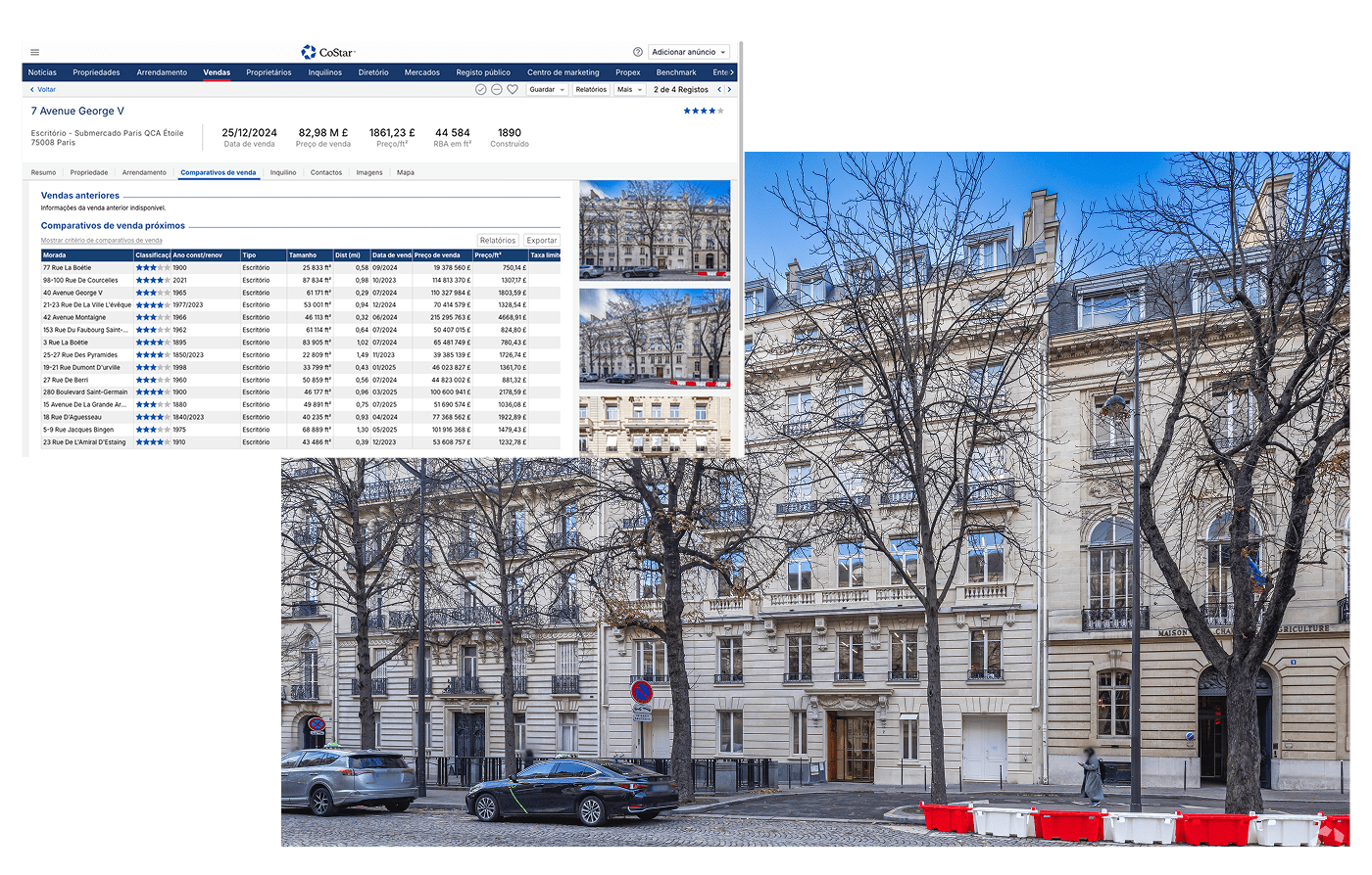 Os comparativos de venda estão associados a uma grande quantidade de dados da CoStar sobre inquilinos, vagas, anúncios de venda e muito mais.