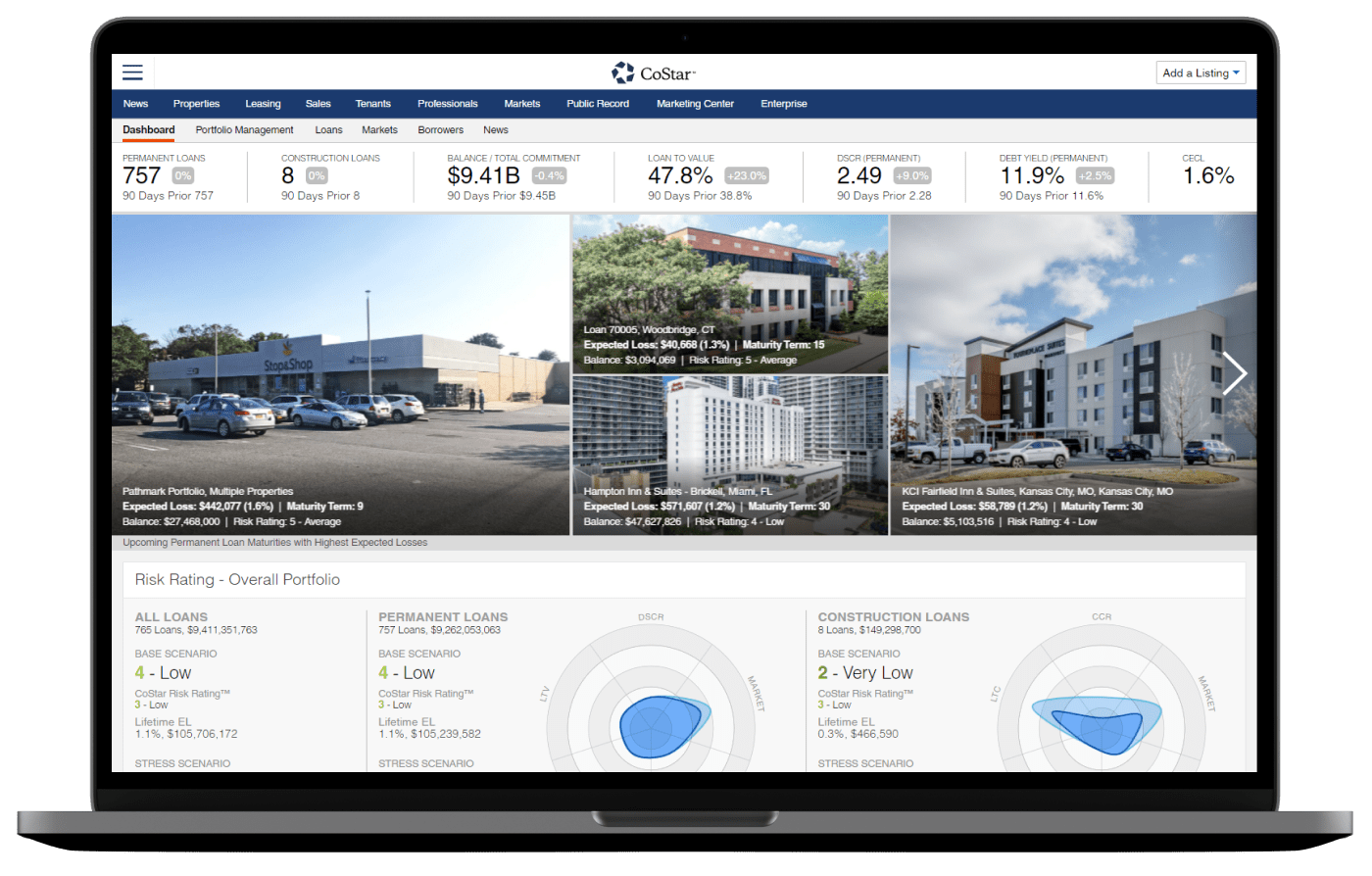 Selecione qualquer uma das 6,8 milhões de propriedades da CoStar, introduza informações sobre empréstimos e receba um quadro de pontuação completo com dados sobre as propriedades, análises de mercado e classificações de risco.