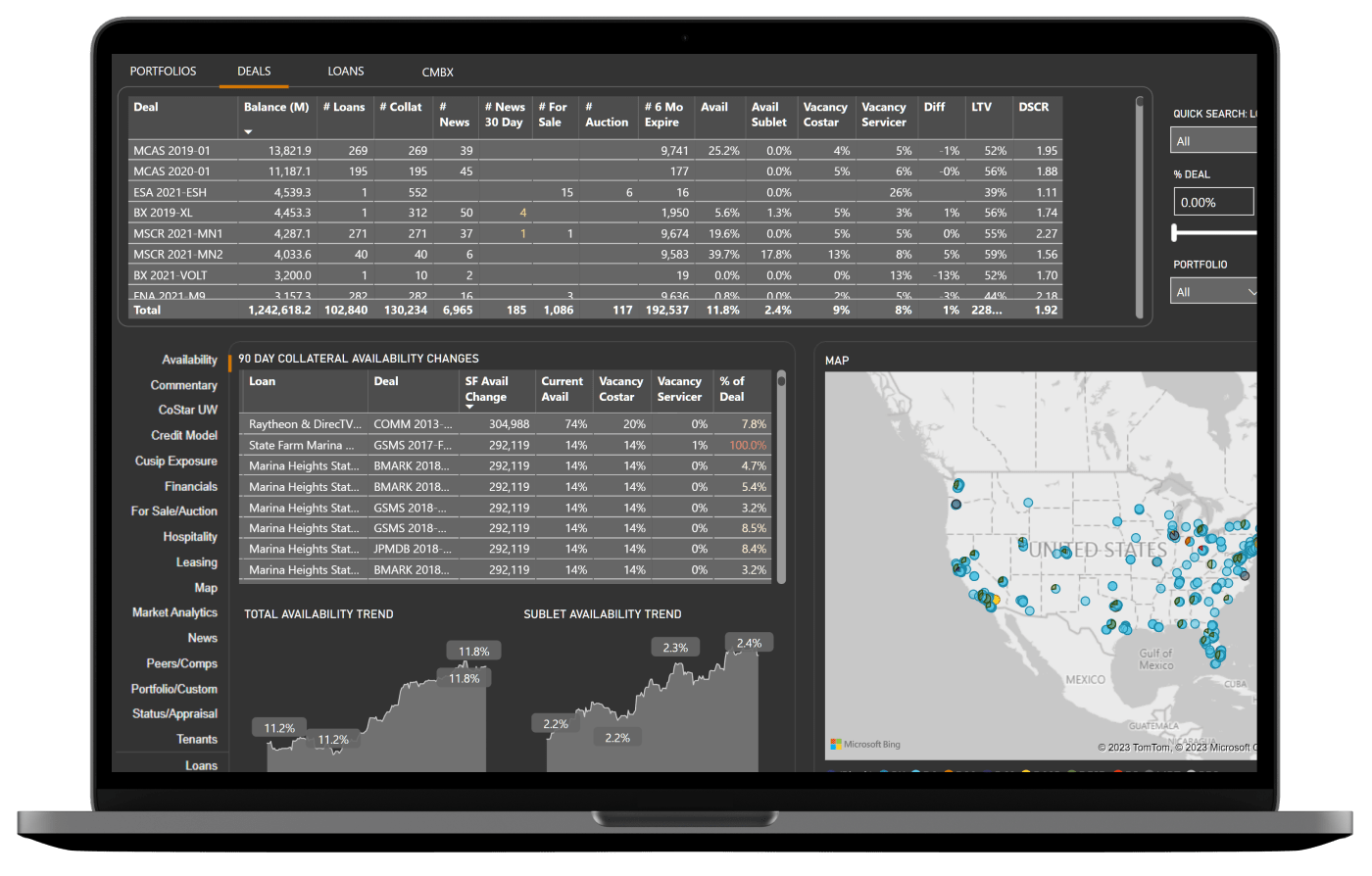 Uma Plataforma de Investidores CMBS abrangente que integra os dados CMBS da INTEX, os dados CRE líderes de mercado da CoStar, a análise de mercado e o Modelo de Incumprimento de Crédito COMPASS, tudo mapeado diretamente para cada uma das suas transações CMBS, empréstimos e propriedade colateral.