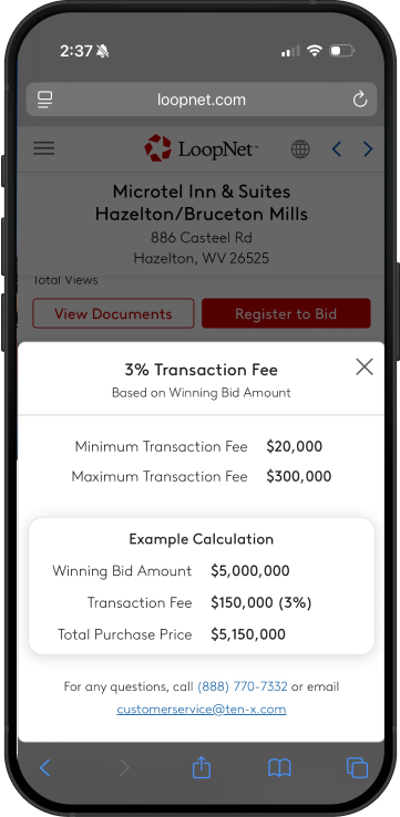 Auctions by Ten-X helps you close exponentially faster with an accelerated sales process, due diligence performed before offers are made and the largest global audience of serious investors. Our auctions feature the most competitive buyer transaction fee in the industry, at just 3%. This is just one of many ways our platform is built to drive stronger bids and better outcomes for your listings.